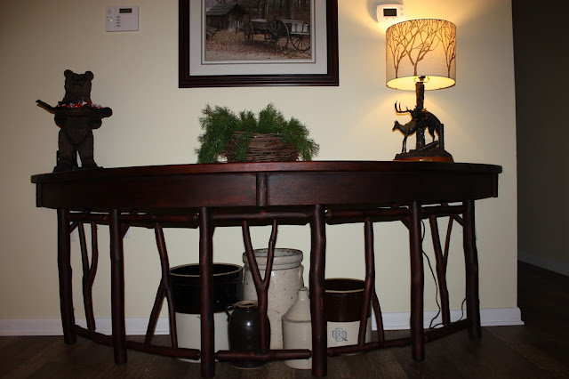 I also decided to group my crocks and jugs together instead of having them spread out all over the house. The perfect spot was under the entry way table.